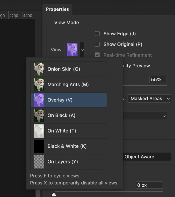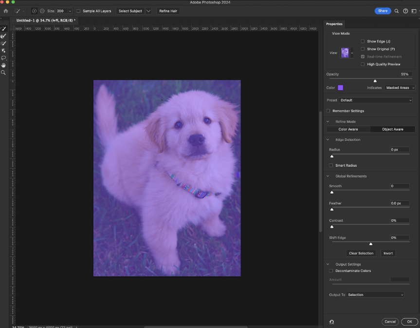 Select and Mask가 활성화되고 편집을 더 섬세하게 할 수 있는 창이 뜨면