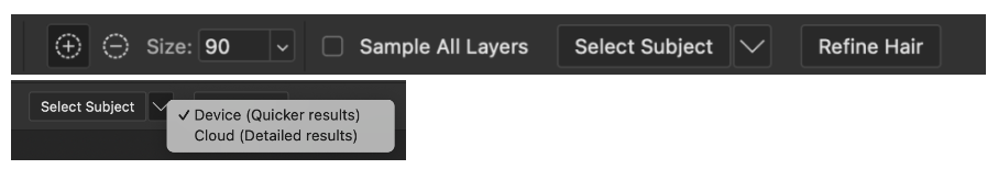 Select Subject : 포토샵이 자동으로 이미지 내에 선택할 피사체를 인식하여 영역을 잡아줍니다. 선택된 영역을 확인한 후 오른쪽 추가 조정을 통해 보다 섬세하게 누끼를 딸 수 있는 기능 --> 옵션버튼를 열어 Device (Quicker results)를 선택해 줍니다.